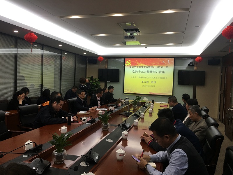 2017年12月7日下午,福日電子以黨委中心組學(xué)習(xí)(擴(kuò)大)會(huì)的形式舉辦黨的十九大精神學(xué)習(xí)講座,特邀福建師范大學(xué)馬克思主義學(xué)院院長、博士生導(dǎo)師李方祥教授作了題為《新思想引領(lǐng)新時(shí)代,新使命開啟新征程》的十九大精神輔導(dǎo),公司黨委委員、成員企業(yè)、事業(yè)部副總以上領(lǐng)導(dǎo)、本部助理以上管理人員以及機(jī)關(guān)支部全體黨員近40人參會(huì)。