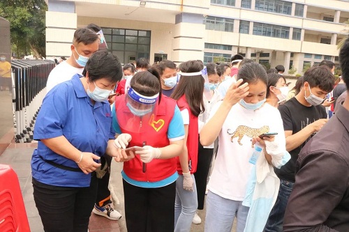 從早上8點半起,周邊企業(yè)的員工們就分批來到等待區(qū)域?!罢埻@里走。”“麻煩出示一下行程碼。”一抹抹白色與紅色交織的身影,正在進行現(xiàn)場分流引導(dǎo)、幫忙查詢行程,他們正是由邁銳光電黨支部黨員和入黨積極分子組成的7人志愿者隊伍。在他們的助力下,現(xiàn)場每個步驟環(huán)環(huán)相扣、有條不紊,在當(dāng)日16時即完成全部6500余人的核酸檢測工作,讓黨旗在防疫一線高高飄揚。