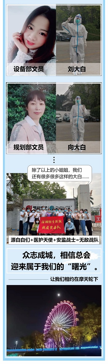 無獨有偶,源磊科技也用“微光聚愛”。從2月26日至3月22日,在其中的13個日子里,源磊科技的16名志愿者“逆行”奔赴防疫前線,配合當(dāng)?shù)赜嘘P(guān)部門開展消毒、核酸檢測等工作。無論驕陽似火,亦或刮風(fēng)下雨,這群“大白”們都堅守在志愿服務(wù)一線。正如他們所說,疫情當(dāng)前,他們從不缺席,迎接美好四月天是他們堅持的動力。