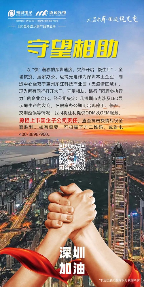 因為疫情,以“快”著稱的深圳速度,也突然開啟“慢”生活。3月15日,邁銳光電發(fā)布信息,表示該公司制造中心坐落在無疫情區(qū)域的惠州東江科技產(chǎn)業(yè)園,如深州市內(nèi)涉及LED顯示屏生產(chǎn)的友商,在居家辦公期間出現(xiàn)停工、停產(chǎn)、交期延誤等情況,該公司將讓利提供ODM及OEM服務(wù),直至抗擊疫情戰(zhàn)役全面勝利,充分展現(xiàn)其“同理心執(zhí)行力”的企業(yè)文化和“守望相助”的使命責(zé)任。