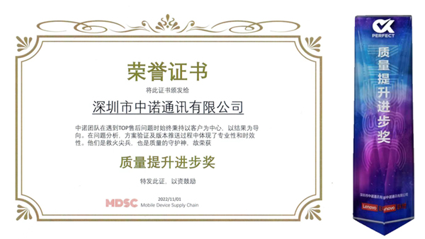 近日,2022年聯(lián)想供應(yīng)商質(zhì)量論壇主題分享及年度頒獎(jiǎng)在線上拉開(kāi)帷幕,福日電子成員企業(yè)深圳市中諾通訊有限公司在線上出席了此次活動(dòng)?!敖臣壹甲钋?,能工事尤精”,今年中諾項(xiàng)目的售后返修率TCRR指標(biāo)滿(mǎn)足目標(biāo)要求并持續(xù)降低,在本次論壇中獲得多次表?yè)P(yáng),并榮獲“聯(lián)想2022年度質(zhì)量提升進(jìn)步獎(jiǎng)”。