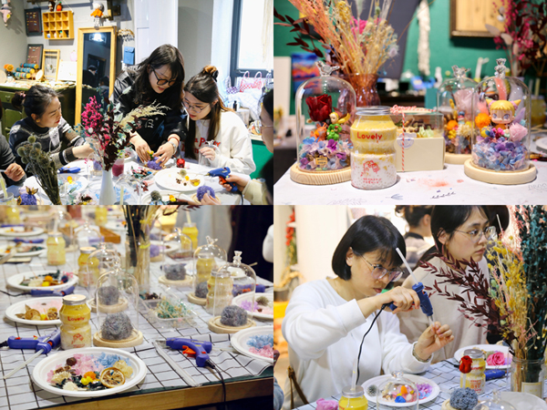 活動現(xiàn)場,花藝師就如何安放主花、固定花瓣、插花造型等步驟和技巧等進行了詳細講解。大家選擇好心儀的花材,充分發(fā)揮創(chuàng)意和想象力,精心將每一朵花、每一片葉插放和鋪貼,使原本樸實無華的花托瞬間花團錦簇、生機盎然。活動中,大家你瞧瞧我的,我看看你的,相互交流搭配心得,在歡聲笑語中完成了一份份精美且獨一無二的永生花作品。大家手捧親手制作的永生花合影留念,定格美好瞬間。