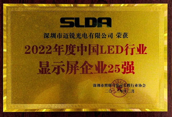 再次獲得“2022年度中國LED顯示屏行業(yè)25強(qiáng)企業(yè)”獎項(xiàng),體現(xiàn)了行業(yè)對邁銳光電在過去一年在顯示科技水平以及項(xiàng)目設(shè)計方案等方面所取得成績的高度認(rèn)可,尤其是在顯示科技水平和項(xiàng)目設(shè)計方案方面,贏得了業(yè)界的廣泛贊譽(yù)。