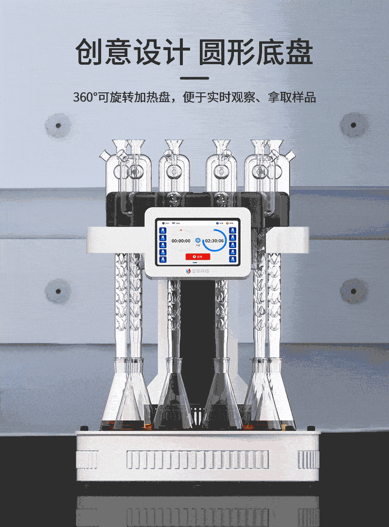3、旋轉(zhuǎn)底盤(pán):加熱盤(pán)采用左右可旋轉(zhuǎn)360°設(shè)計(jì),便于用戶實(shí)時(shí)觀察樣品消解狀態(tài),快速添加耗材、拿取樣品;