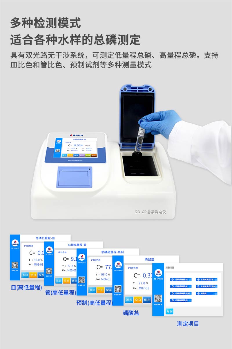 1、多種測(cè)定模式:具有雙光路無干涉系統(tǒng),可測(cè)定低量程總磷、高量程總磷。支持皿比色和管比色、預(yù)制試劑等多種測(cè)量模式;